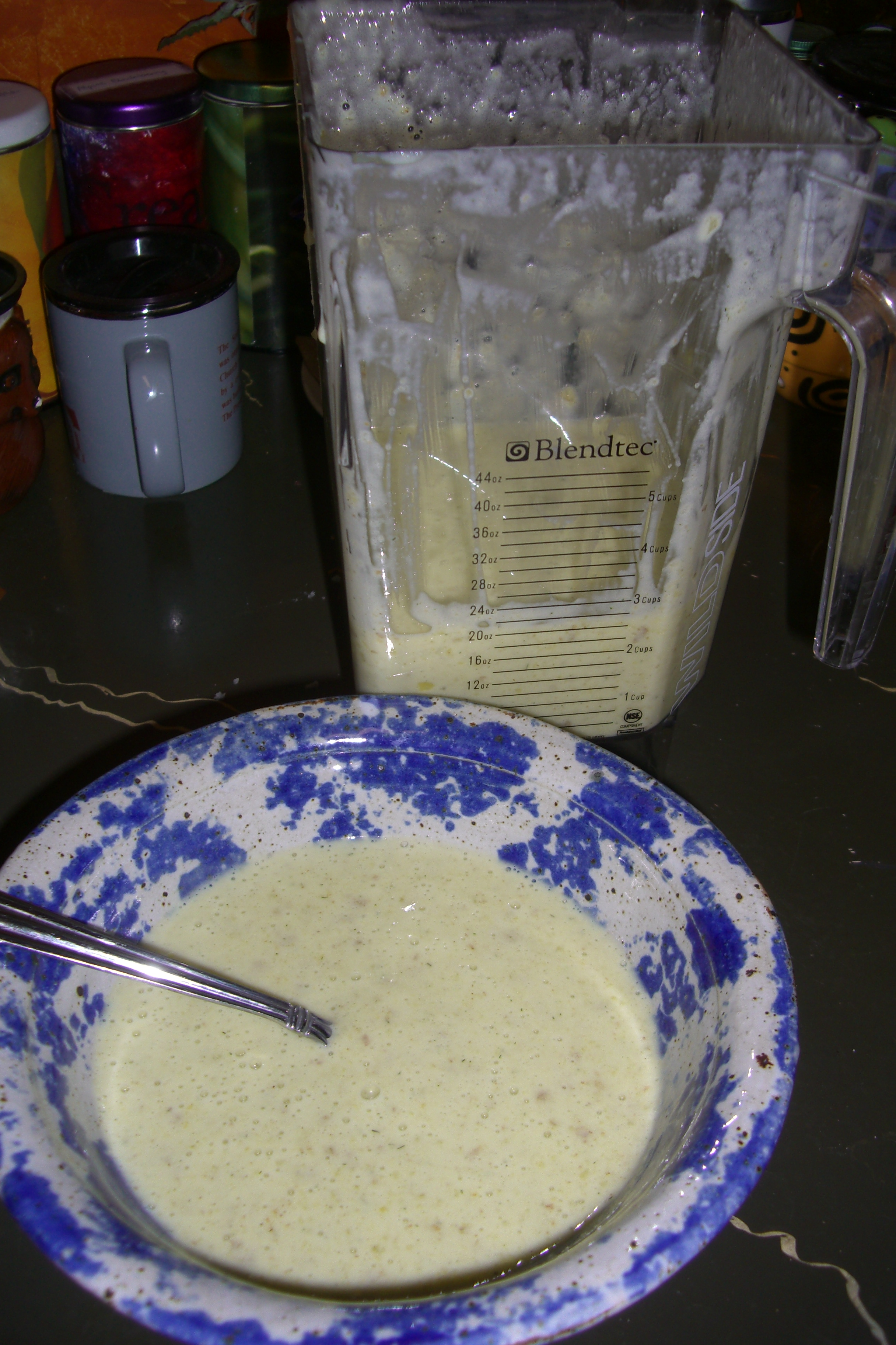 Tonight, however, I ventured into the world of soup. The most amazing part of making soup with this blender is the fact that it gets going so fast that the friction – or whatever physics are going on – actually heats it up. No cook soup. Genius. I’ve made one other soup so far, based on a recipe in the handy cookbook that comes with the blender, and tonight I tried a modified version of the “Bacon Cheddar Potato Soup.”