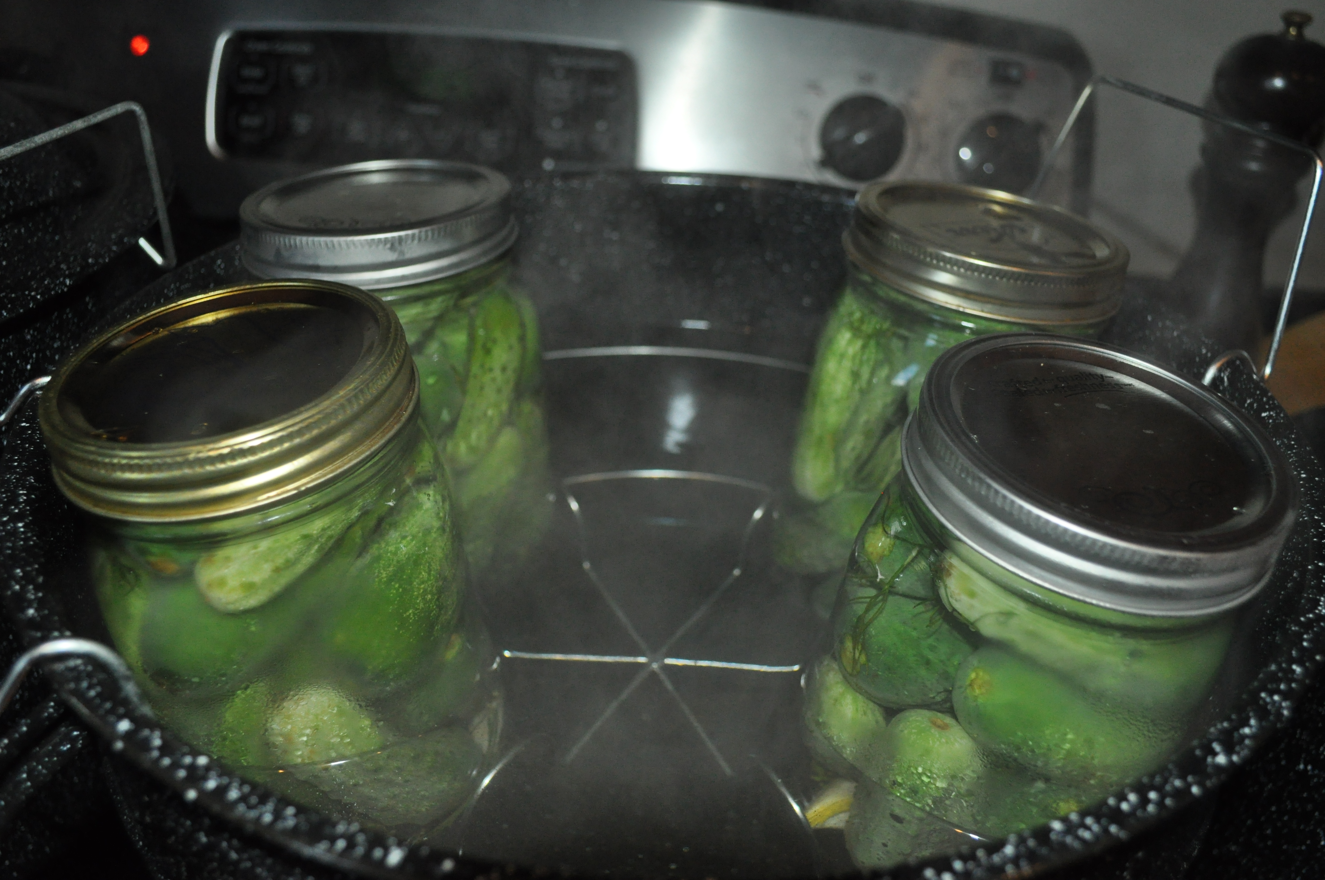 The canning I have learned thus far has been hot water bath canning, which can only be used for acidic foods, such as tomatoes, jams and pickles. Vegetables and anything with meat must be pressure canned, which gets the food to a high enough temperature to prevent the growth of Clostridium botulinum, which causes botulism. Canning is a lot of fun, but food safety is to be taken seriously, as the results can be fatal if it is not done properly. Most of the time, if you follow recipes which have been tested for safety, this is easy to avoid. Unfortunately, this means that, while many of the techniques we learned from grandma are still be applicable, some of her recipes may not be. If you’re not sure what kind of canning you need to do, this webpage offers some basics on how to decide.