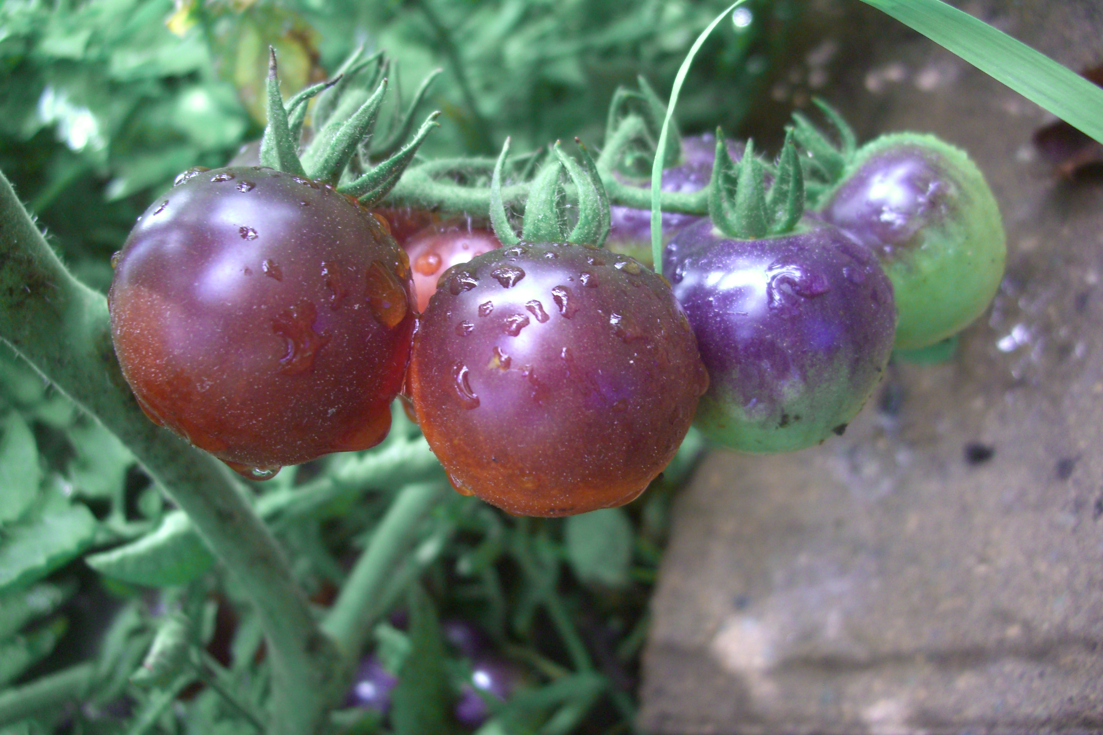 The leaves of the plant have a slightly bluish tint and tend to curl up on the edges a bit. So far we’ve harvested about a dozen and a half of these two-tone tomatoes. They start off part purple and part green, ripening to red and indigo blue. Roughly the size of a ping-pong ball, they aren’t sweet to speak of, but have a well-rounded full flavor. The plant is incredibly prolific and the tomatoes grow in bunches, as can be seen in the picture.