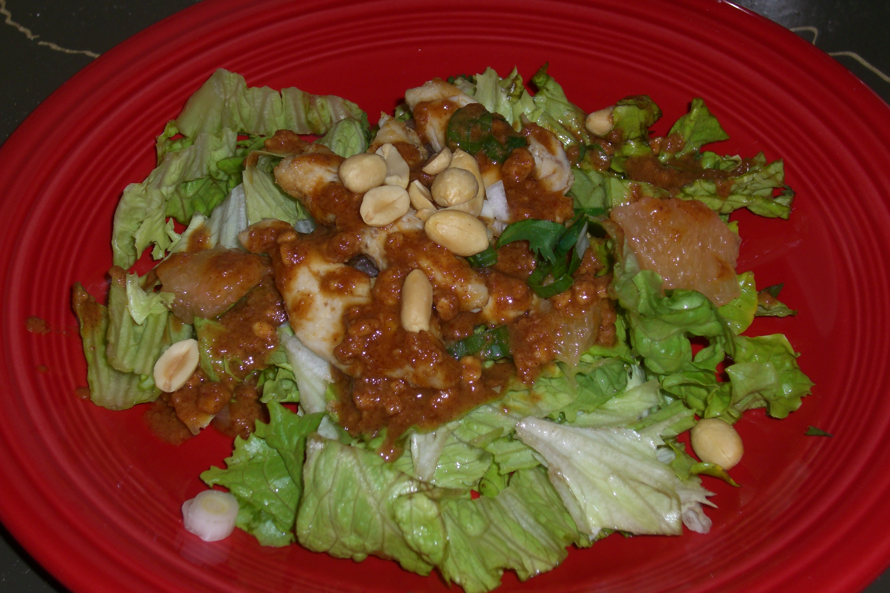 5. Arrange lettuce on plates. Top with chicken, grapefruit sections, peanuts and scallions. Pour dressing over the salads and top with cilantro, if using.